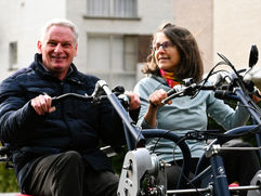 Daarom hebben we samen met onze cliënten heel wat fietsen uitgeprobeerd en de elektrische duo-fiets voldoet het meest aan onze noden. Hierbij kan een cliënt stabiel en veilig plaatsnemen naast een begeleider en kan hij/zij zelf kiezen om mee te trappen of om even uit te rusten. De fiets is voorzien van een draaibare zit waardoor ook minder mobile cliënten eenvoudig kunnen opstappen.